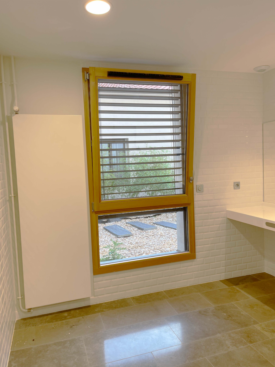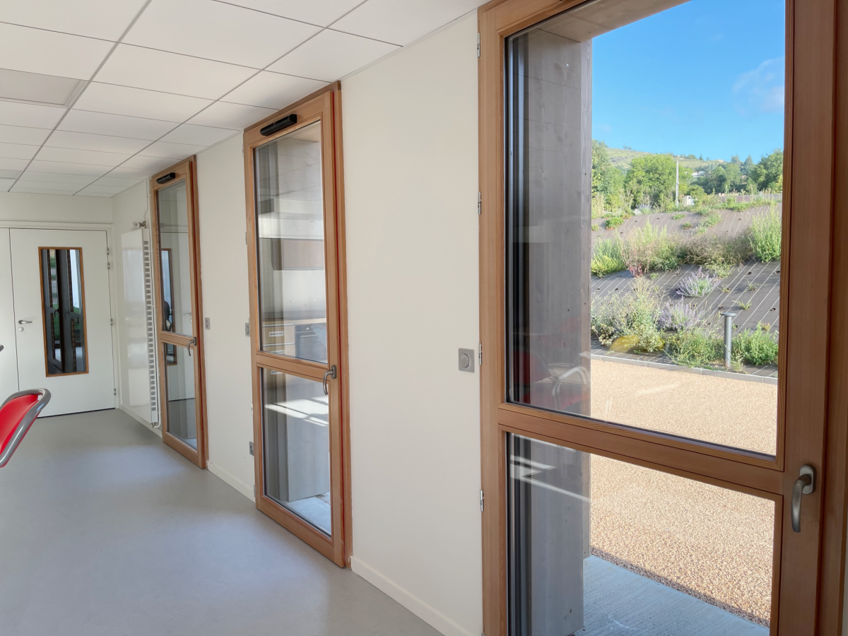 • Sur la partie neuve : 94 menuiseries bois 68 mm Mélèze en finition lasure NABOCO bi-coloration, 93 BSO et mur rideau en aluminium réalisé par GAUTHIER Menuiserie.